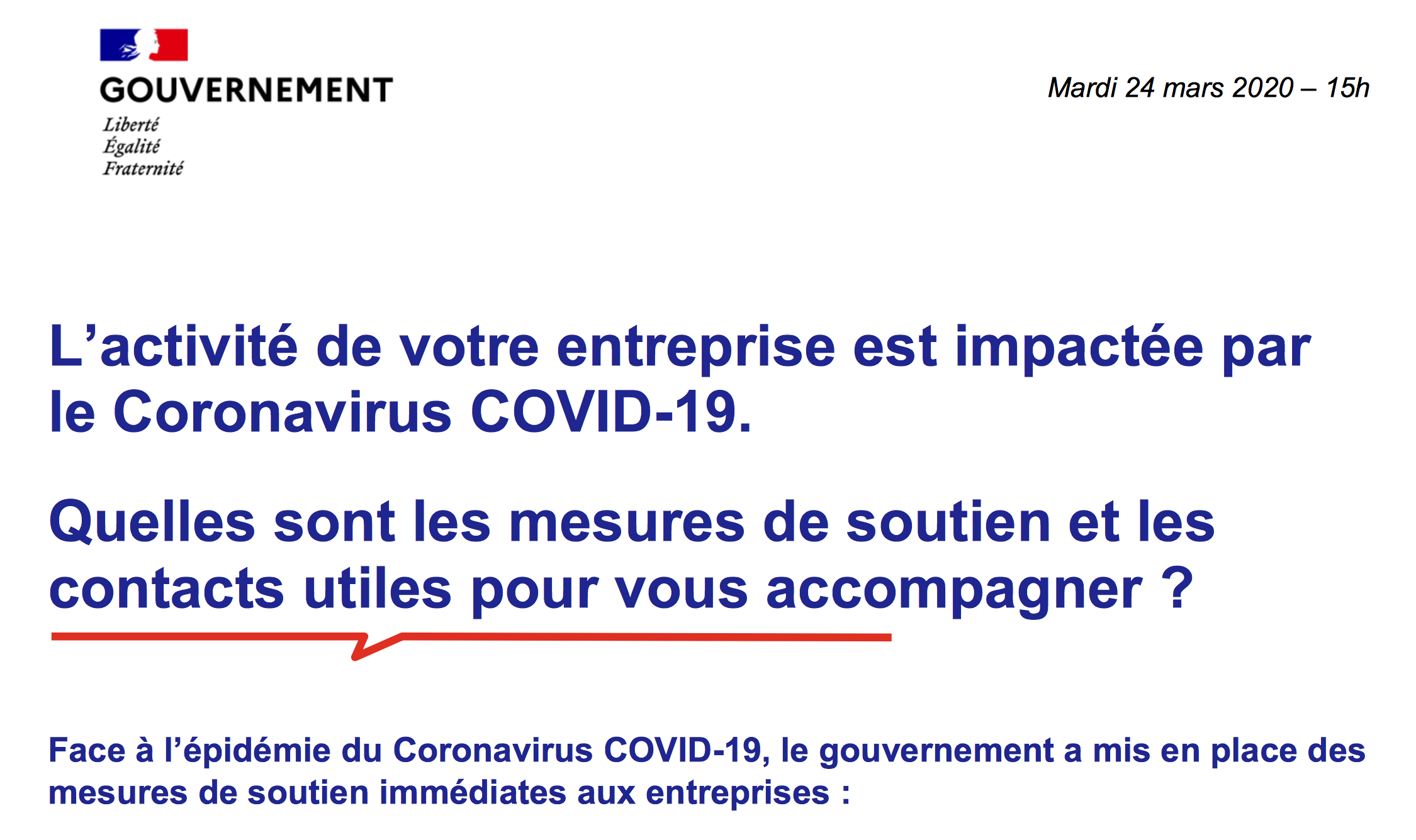 C’est pourquoi, le Gouvernement a rapidement souhaité mettre en place des mesures pour protéger l’activité. Il accorde aux entreprises des reports de charges fiscales et sociales, des annulations pouvant être envisagées au cas par cas pour éviter les faillites. Cela représente un effort de trésorerie pour l’Etat de 35 Md€.